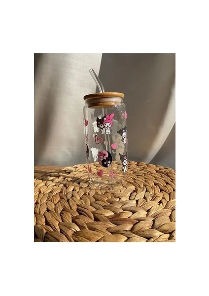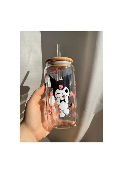Minnaco Pipetli Bardak – Su Geçirmez Kuromi Baskılı 500 ml Cam Bardak | Hediyelik Kapaklı Kahve & Soğuk İçecek Bardağı