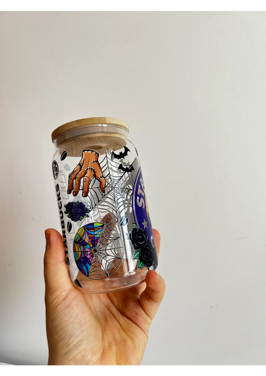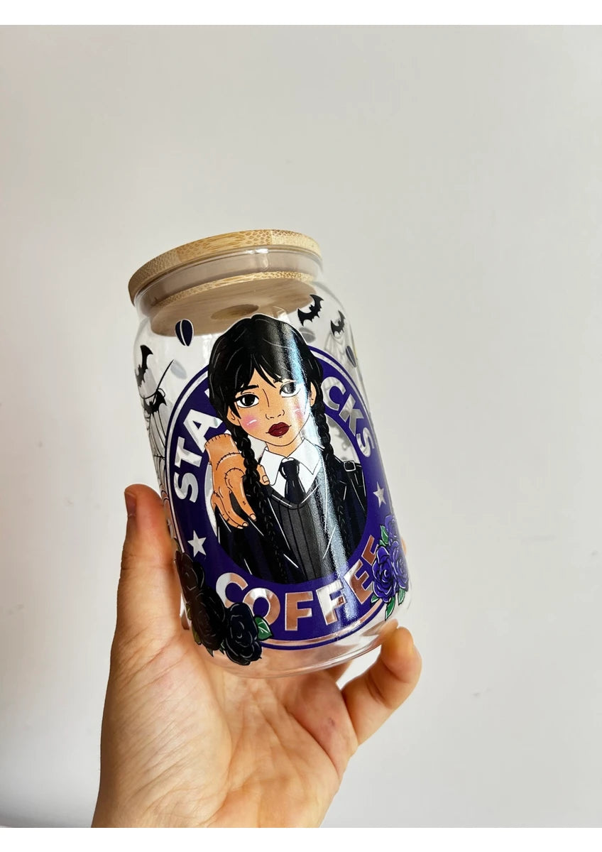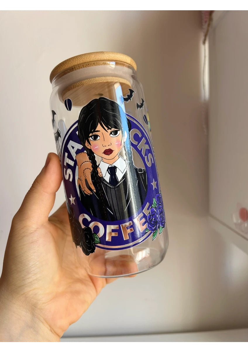 Bu 500 ml kapasiteli, kapaklı ve pipetli cam bardak; popüler Wednesday temasıyla el yapımı olarak hazırlanmıştır. Estetik görünümüyle hem içeceklerinize keyif katar hem de dekoratif bir obje olarak dikkat çeker. Kahve, soğuk içecekler, smoothie, limonata ve kola için ideal bir kullanım sunar.